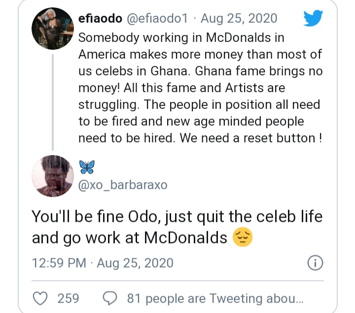 “Somebody working in McDonalds in America makes more money than most of us celebs in Ghana. Ghana fame brings no money! All this fame and Artists are struggling. The people in position all need to be fired and new age minded people need to be hired. We need a reset button!”