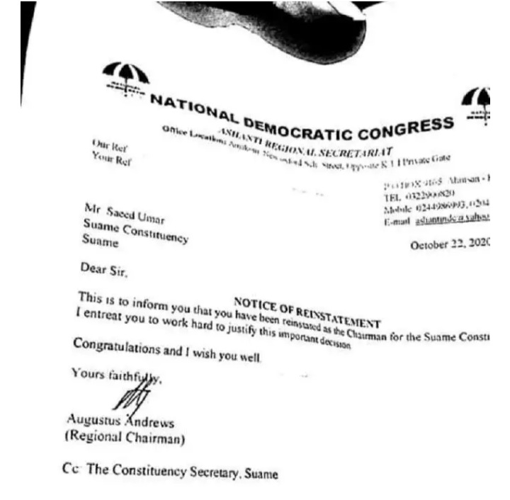 But a letter signed by Ashanti Regional Chairman of the NDC Augustus Nana Akwasi sighted by MyNewsgh reads in part “This is to inform you that you have been reinstated as the Chairman for the Suame Constituency, I entreat you to work hard to justify to this important decision”
