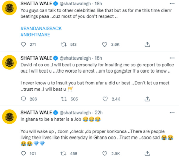 “David Nicole-Sey, I will beat u personally for insulting me so go report to police cuz I will beat u …the worse is arrest ..am too gangster if u care to know… I never know u to insult you but from afar u did ur best…Don’t let us meet ..trust me, I will beat u,” Shatta Wale wrote in a tweet dated, September 10.