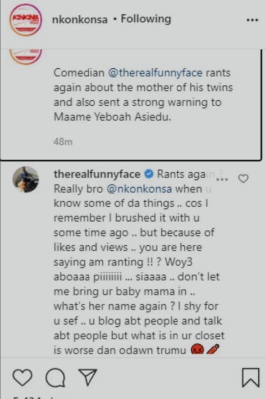 Funny Face wrote, ‘ Rants again ? Really bro @nkonkonsa when u know some of da things .. cos I remember I brushed it with u some time ago .. but because of likes and views .. you are here saying am ranting !! ? Woy3 aboaaa piiiiiiii … siaaaa .. don’t let me bring ur baby mama in .. what’s her name again ? I shy for u sef .. u blog abt people and talk abt people but what is in ur closet is worse dan odawn trumu 😡🧨🔥🔪’