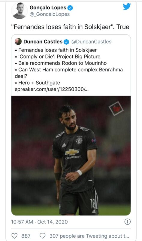 Speaking on ‘The Transfer Window’ podcast, Duncan Castles said those reports were true and added he’d been told by a source close to the player that Fernandes doesn’t believe Solskjaer is ‘strong enough to manage the squad’ or ‘have the capabilities to push the players they have forward.’