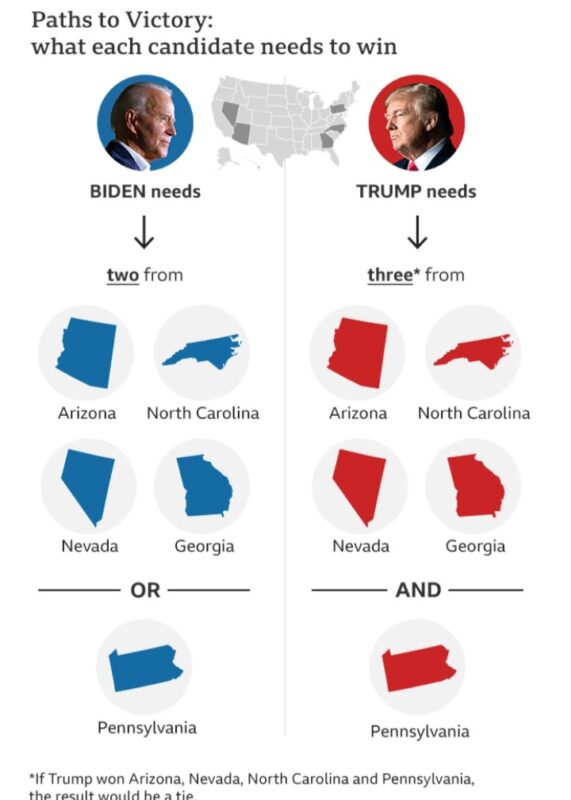 Pennsylvania, where Mr Biden was born, has 20 Electoral College votes. If the Democrat wins it, he would secure the victory with 273 votes.