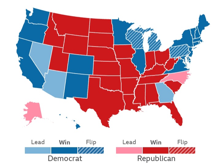 Some news organisations have a higher tally for Mr Biden, having projected a win for the Democrat in Arizona. But the BBC considers the state too early to call.