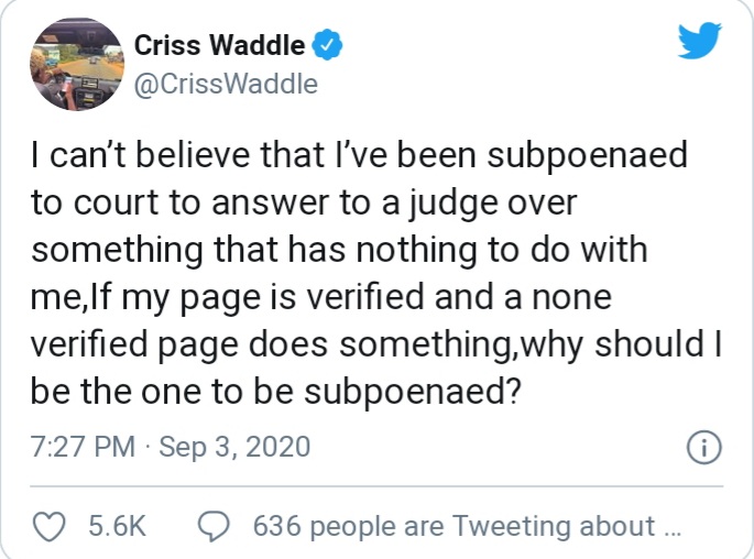 I can’t believe that I’ve been subpoenaed to court to answer to a judge over something that has nothing to do with me,If my page is verified and a none verified page does something,why should I be the one to be subpoenaed?