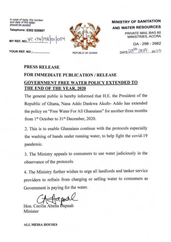 A statement signed by the Minsiter for Sanitation and Natural Resources, Hon. Cecilia Abena Dapaah, on Wednesday, 23rd September 2020 has announced government’s plan to extend the free water policy to the end of the year.