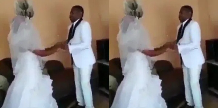 In the interesting video which has surfaced online, the bride and groom were seen facing each other, and then a voice was heard saying – you may now kiss the bride, ostensibly coming from the officiating pastor. However, the man had other ideas as he was momentarily seized by the holy spirit by praying spontaneously.