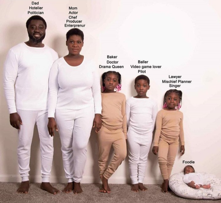 In this video, Mercy Johnson was seen sitting next to her husband and four kids with the youngest in the arms of his father who was busy on the phone.
