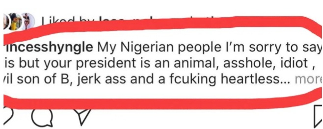 While several Nigerian celebrities who started this whole movement on social media bash the president for his disappointing speech, Princess Shyngle has made the meanest comments ever along the same tangent. In an Instagram post, the Gambian actress based in Ghana did not mince words at all by calling Buhari an animal, idiot amongst other derogatory words.