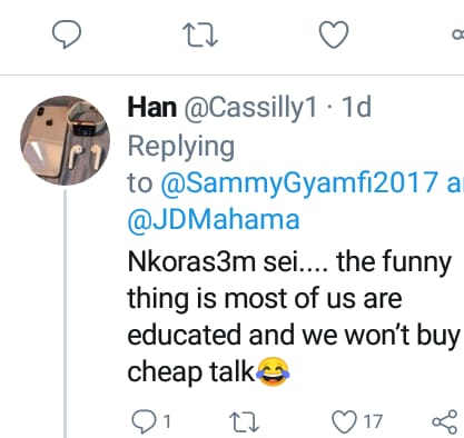 After the post of Sammy Gyamfi,one of his followers with the name Han@Cassilly replied to Sammy Gyamfi saying “nkorasɛm sei (childish thing)the funny thing is most of us are educated and we won’t buy this cheap talk.