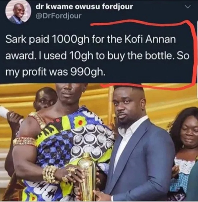 After the truth was revealed that the award Dr Kwame Fordjour recently shared is fake,many secrets have started popping out. According to an Instagram post sighted by Browngh.com,it was noted that Sarkodie paid ¢1000 for the award.