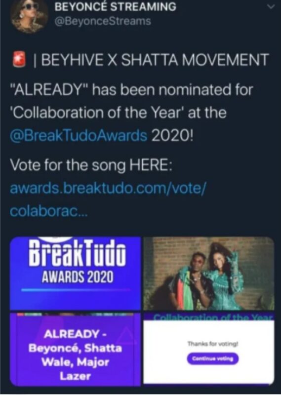 Meanwhile, fans of Shatta Wale- known boisterously as Shatta Movement, have begun spreading the news on social media so all members could vote for their superstar and Beyonce to grab the award.