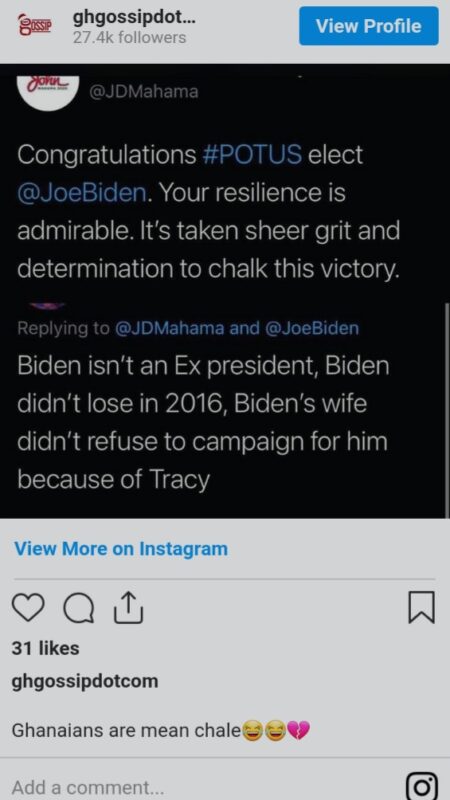 Well, the netizen thinks that Mahama is trying to inform Ghanaians that he might also become the next President of Ghana as Joe Biden has become the President of the USA.