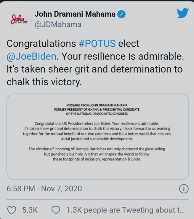 The flagbearer of the National Democratic Congress(NDC), John Dramani Mahama took to his Twitter yesterday to congratulate the President-Elect of the United States of America, Joseph Robinette Biden Jr. as he becomes the 46th President of America.