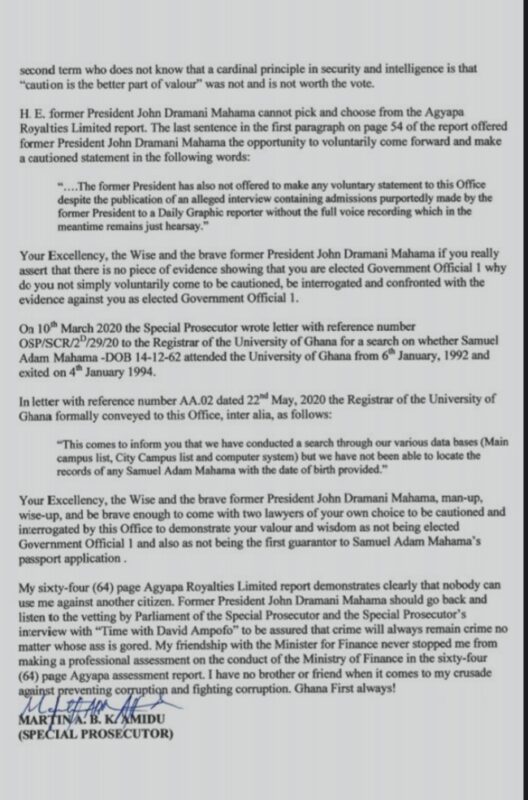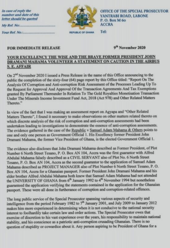 “Your Excellency, the wise and the brave former President John Dramani Mahama, man-up, wise-up, and be brave enough to come with two lawyers of your own choice to be cautioned and interrogated by this Office to demonstrate your valour and wisdom as not being elected Government Official 1 and also as not being the first guarantor to Samuel Adam Mahama’s passport application,” Amidu said in a statement issued on Monday, November 9, 2020.