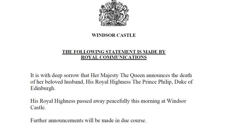 A statement from Buckingham Palace said: “It is with deep sorrow that Her Majesty The Queen has announced the death of her beloved husband, His Royal Highness The Prince Philip, Duke of Edinburgh. His Royal Highness passed away peacefully this morning at Windsor Castle.”