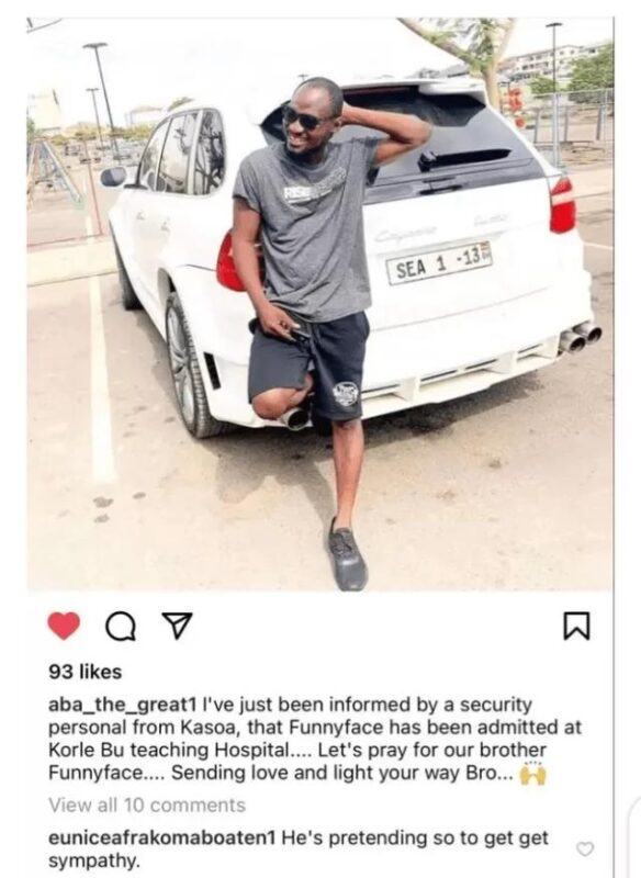 The condition surrounding Funny Face’s admission at the hospital is still unknown. We are also trying hard to get in touch with him to ascertain the truth.