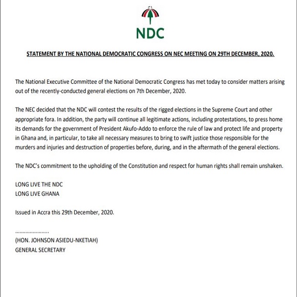 The National Democratic Congress, wishes to inform the general public that at about 12PM this afternoon, the leader and Presidential Candidate of the party, H.E John Dramani Mahama, caused his lawyers to file a Petition in the Supreme Court of Ghana to challenge the 2020 Presidential Election Results Declaration by the Chairperson of the Electoral Commission of Ghana.