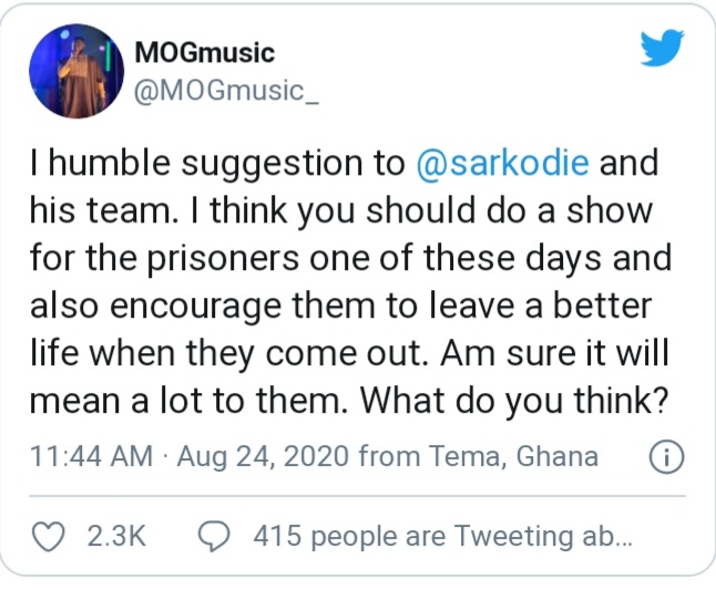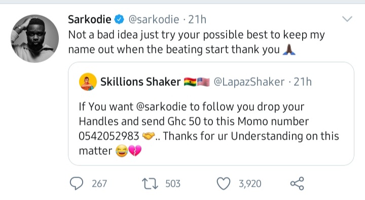 âI donât understand why people are complaining that Sarkodie is not picking their calls and replying to their messages. Why Sarkodiedoesnât pick calls shouldnât be a problem for others but maybe he has a boil.â