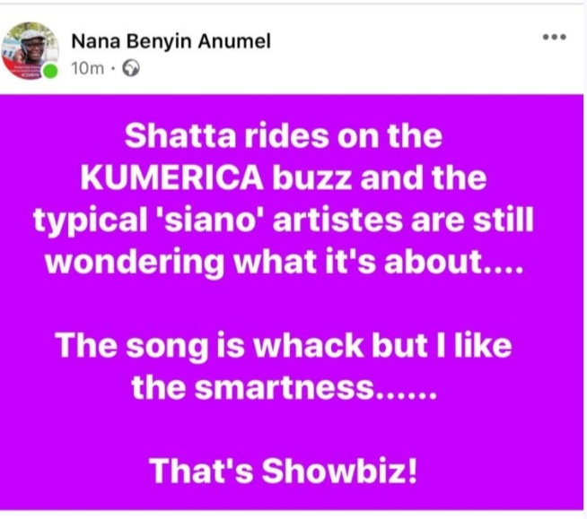 The Brands Manager at Ultimate FM in Kumasi wrote: “Shatta rides on the KUMERICA buzz and the typical ‘siano’ artistes are still wondering what it’s about….