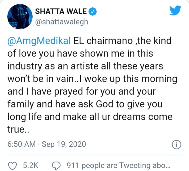 “@AmgMedikal EL chairmano ,the kind of love you have shown me in this industry as an artiste all these years won’t be in vain..I woke up this morning and I have prayed for you and your family and have ask God to give you long life and make all ur dreams come true,” Shatta Wale wrote.