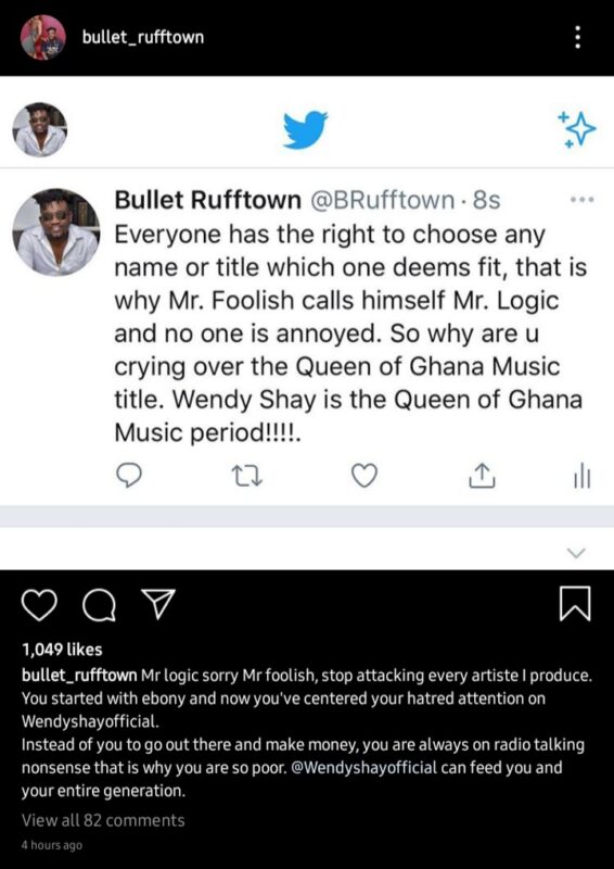 In a post captioned, ”Mr logic sorry Mr foolish, stop attacking every artiste I produce. You started with ebony and now you’ve centered your hatred attention on Wendyshayofficial. Instead of you to go out there and make money, you are always on radio talking nonsense that is why you are so poor. @Wendyshayofficial can feed you and your entire generation”, Bullet responded.