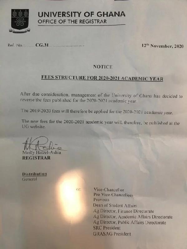 Management of the University of Ghana (UG) has reversed its decision to increase the facility user fees for students for the 2020/2021 academic year.