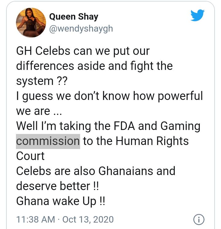 “GH Celebs, can we put our differences aside and fight the system ?? I guess we don’t know how powerful we are … Well, I’m taking the FDA and Gaming commission to the Human Rights Court Celebs are also Ghanaians and deserve better !! Ghana wake Up !!”.